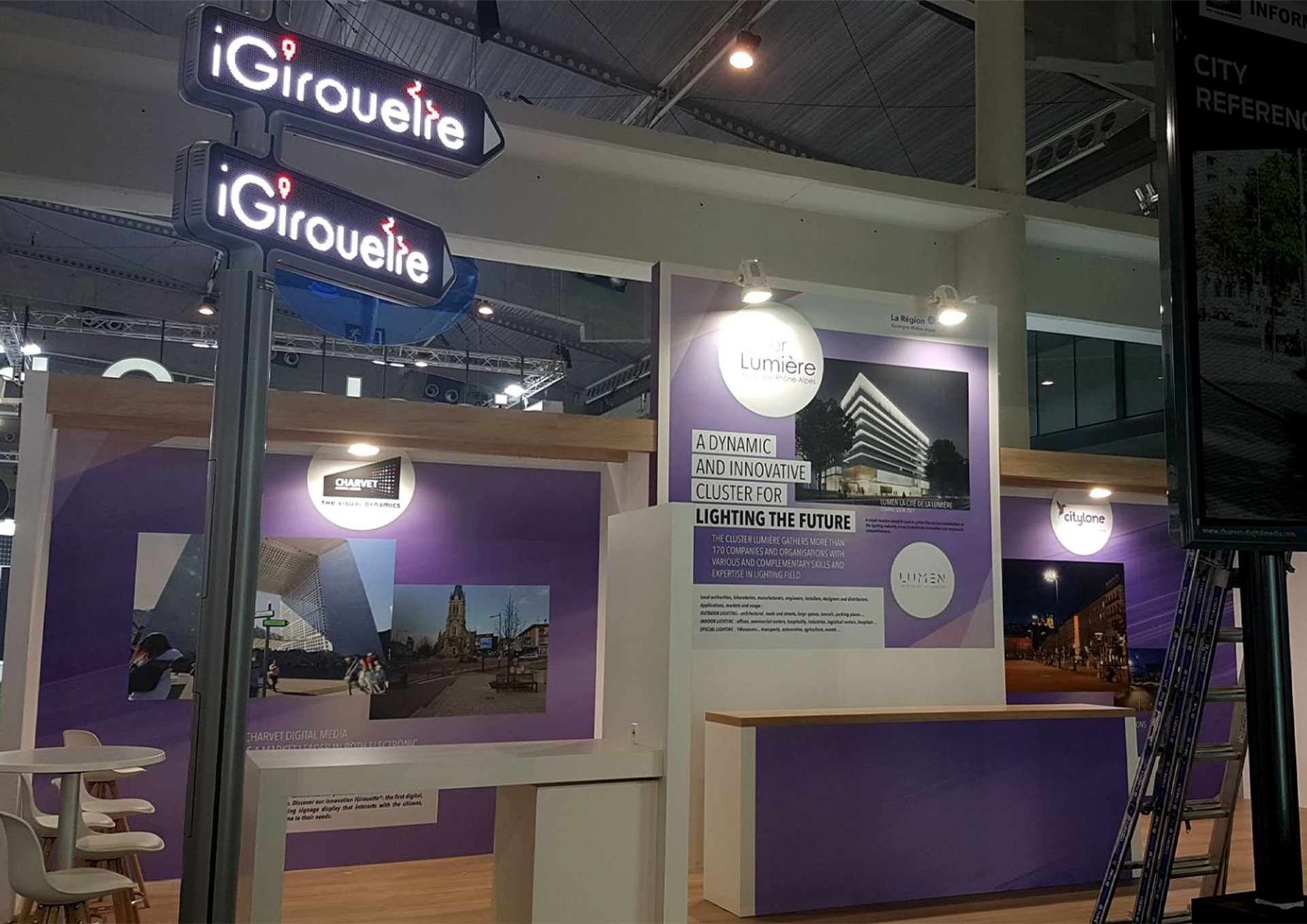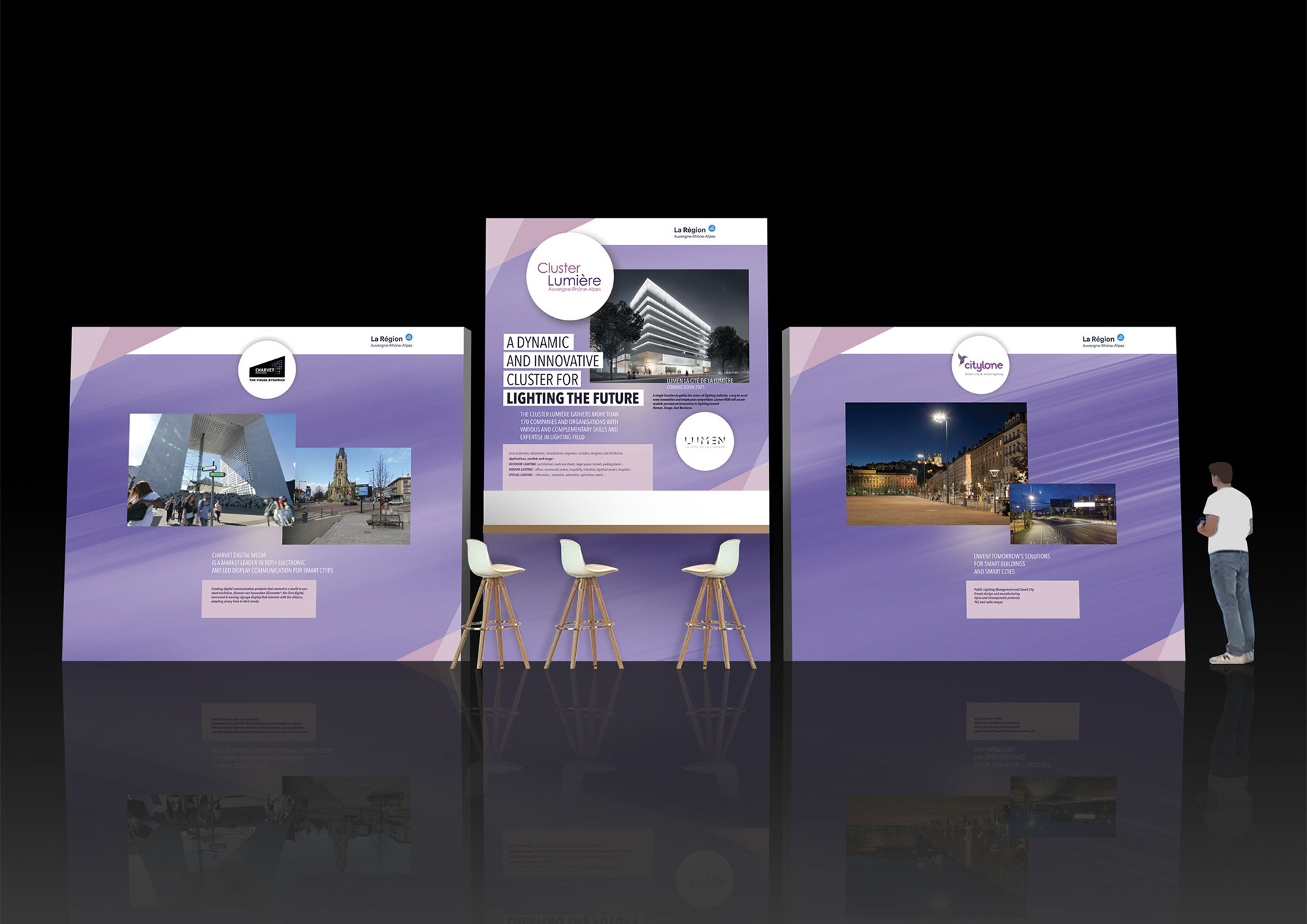 Création d’un stand de 8 mètres de large par 4 mètres de haut pour Cluster Lumière, présenté au salon Smart City À Barcelone.