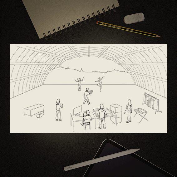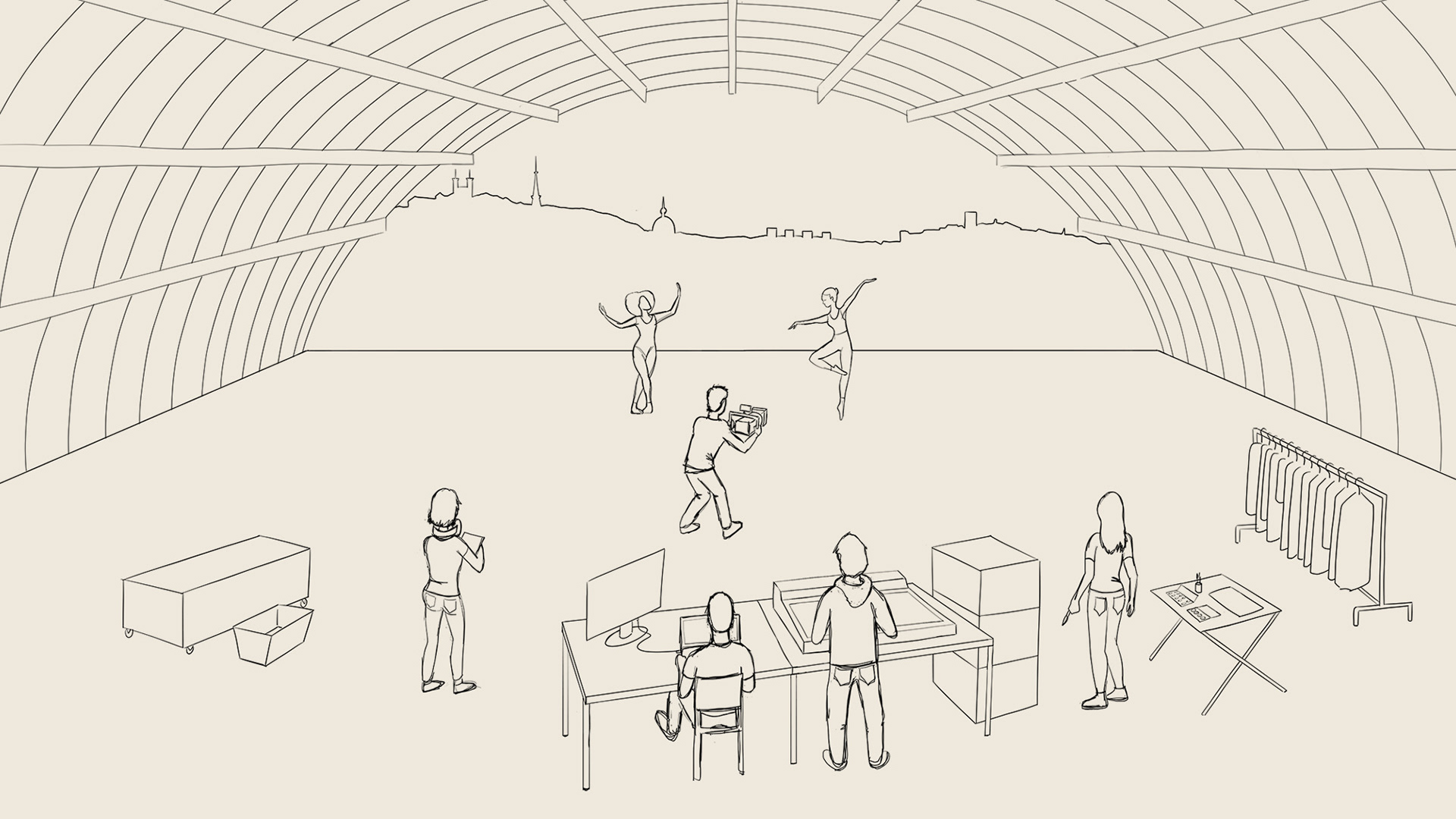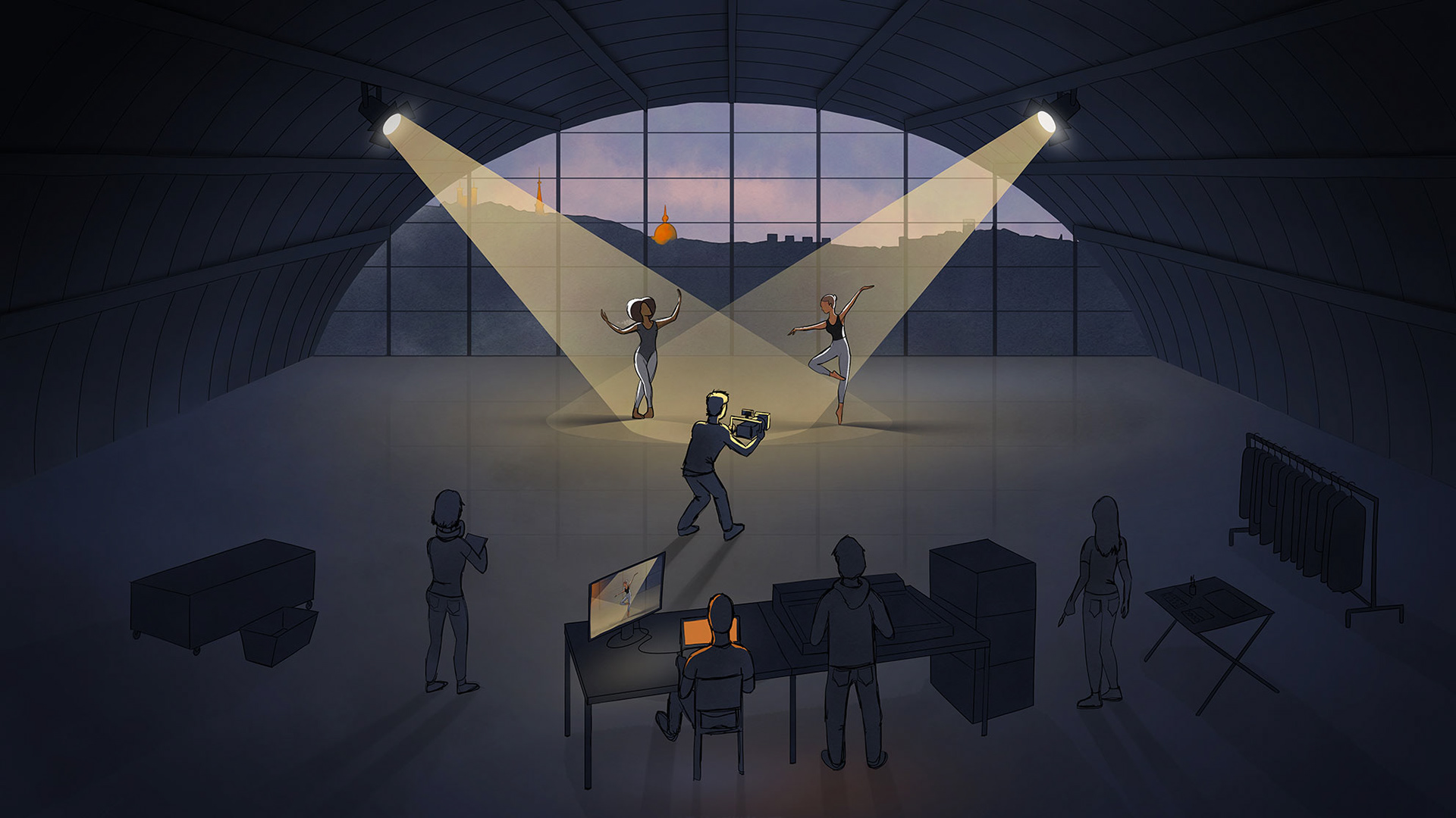 Réalisation d'une illustration pour le projet artistique Saltatio. La demande du client était de mettre en scène une équipe de tournage en train de filmer des danseuses dans la salle de répétition de l'opéra de Lyon.